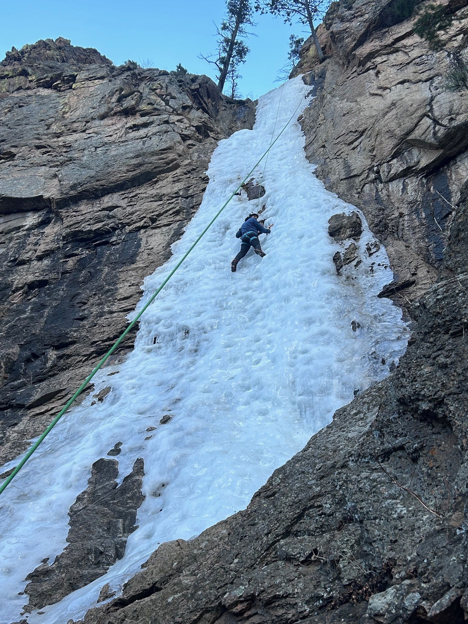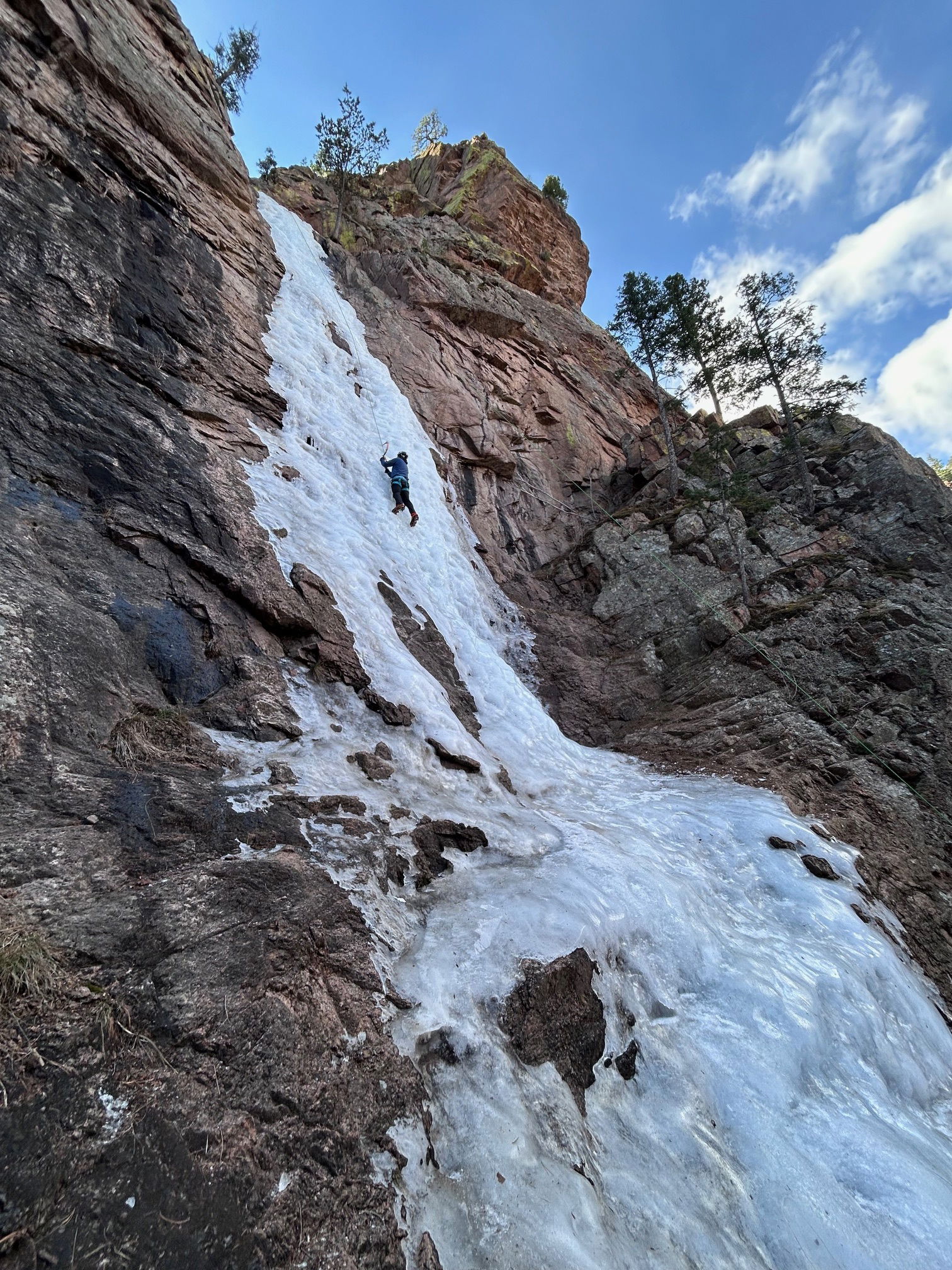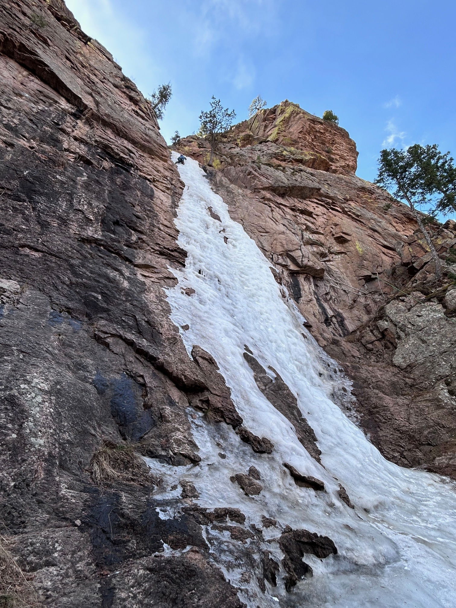 With this trip, we may have gotten one of the last days of climbing at Hully Gully this season unless the temperature drops consistently for an extended period of time. The ice was fun to climb with plastic or styrofoam swings and kicks, but it did seem a bit hollow and detached. Nick free-soloed the the pitch and set up a top rope for the rest of us to enjoy. We all got several laps in over the morning as we were the only party at Hully Gully.